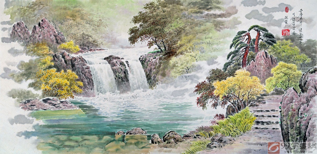 赵元哲(元哲),朝鲜一级画家,1970年基千郡出生,1994平壤美术大学朝鲜画部毕业,现三金岩创作社创作家。创作了百幅风景国画,并在对外展览会上展出,代表作:《香山之秋》。