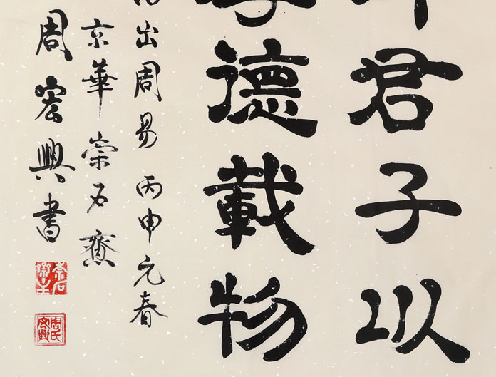 周宏兴教授自幼酷爱书法艺术,多年潜心研究与学习汉隶名碑,汲取众家之长,周宏兴逐渐形成了自己的凝重,古朴高标逸韵的风格,可谓典型的“文人书法”。近年来经过苦心钻研,先生又以指代笔,创造了“隶体指书”新书体。被专家誉为“中国隶体指书第一人,开创书法审美新天地”。 2004年9月29日晚,周先生应国家副主席曾庆红之邀参加了在首都人民大会堂举行的中秋国庆招待会,同时他在人民大会堂澳门厅向佳宾们展示其隶体指书长卷苏东坡《水调歌头》,引起与会者极大震惊。 周宏兴教授的书法艺术受到海内外广泛的关注。他曾四次赴日本举行书法展和讲学。其作品被我国和日本,韩国,美国,英国,印度,加拿大,马来西亚等众多的国际友人珍藏,数百家艺术馆,博物馆和报刊杂志收藏和刊登,并刻石于北京,山东,云南,广东,安徽,浙江等地,中南海和全国政协礼堂均收藏了他的巨幅书法作品,我国党和国家一些领导人,美国前总统布什,国务卿奥尔布赖特,希拉里等均收藏了他的隶书或隶体指书作品。