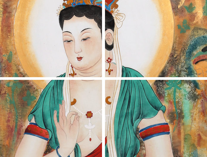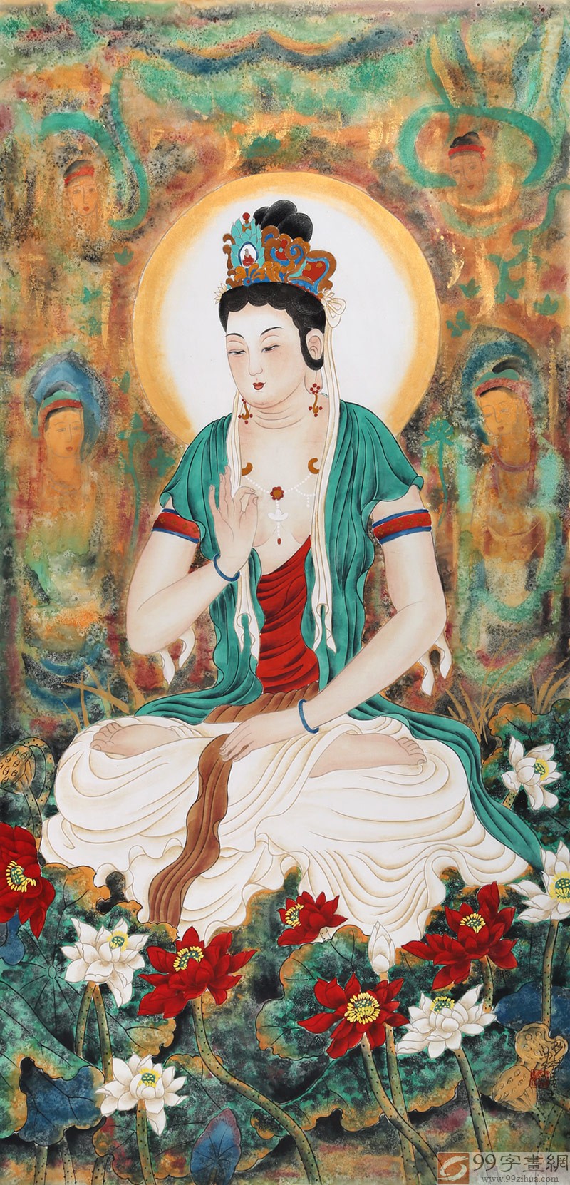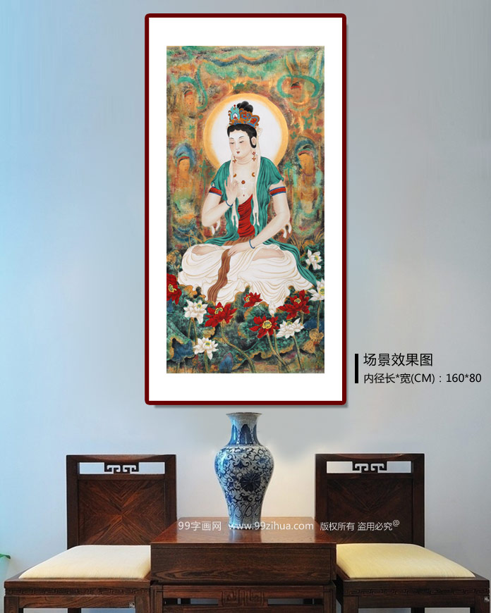 【作品简评】 家中供奉佛像之十大利益:1. 从前所作种种罪过。轻者立即消灭,重者亦得转轻。 2. 常得吉神拥护,一切瘟疫、水火、寇盗、刀兵、牢狱之灾,悉皆不受。 3. 夙生怨对,咸蒙法益,而得解脱,永免寻仇报复之苦。 4. 夜叉恶鬼,不能侵犯,毒蛇饿鬼,不能为害。 5. 心得安慰,日无险事,夜无恶梦,颜色光泽,气力充盛,所作吉利。 6. 至心奉法,虽无希求,自然衣食丰足,家庭和睦,福禄緜长。 7. 所言所行,人天欢喜。任到何方,常为多众倾诚爱戴,恭敬礼拜。 8. 愚者转智,病者转健,困者转亨,为妇女者,报谢之日,捷转男身。 9. 永离恶道,受生善道。相貌端正,天资超越,福禄殊胜。 10.能为一切众生,种植善根。以众生心,作大福田,获无量胜果所生之处,常得见佛闻法。直至三慧宏开,六通亲证,速得成佛。 印造经像,即有如此殊胜功德,故凡遇祝寿、贺喜、免灾、祈求、忏悔、荐拔之时,皆宜欢喜施舍,势力行之。