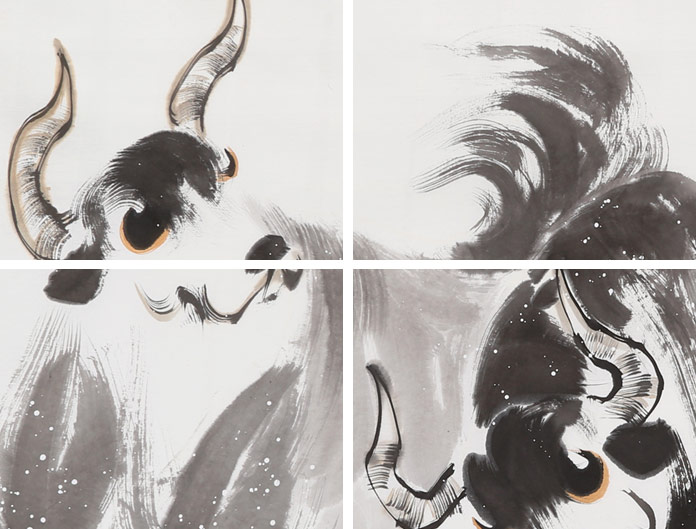 王文煜先生从小居住在甘南草原上,爬雪山、住帐篷,对青藏高原牦牛之习性、神态耳濡目睹,烂熟于胸,尤其对牦牛“俯首孺子而不逞强;鞠躬尽瘁而不居功”的高尚品格和力大无穷,稳步向前,足不踏空、形容无华,器宇轩昂的气势所感染,以大写意画法专攻雪域牦牛,逐渐形成了描绘雪域牦牛风驰电掣,飞蹄雷动、气势雄强,无坚不摧的凌厉画风。