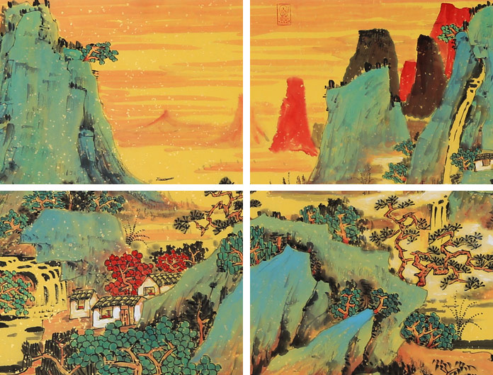 山水作品秀美,用笔潇洒,用墨酣畅,并将水、墨、色融合一体,尤其是作品中的墨色表现,浓墨处浓黑透亮,淡墨处逸而朦胧,蓊郁淋漓,气势磅礴,线条疏秀流畅,刚柔相济。