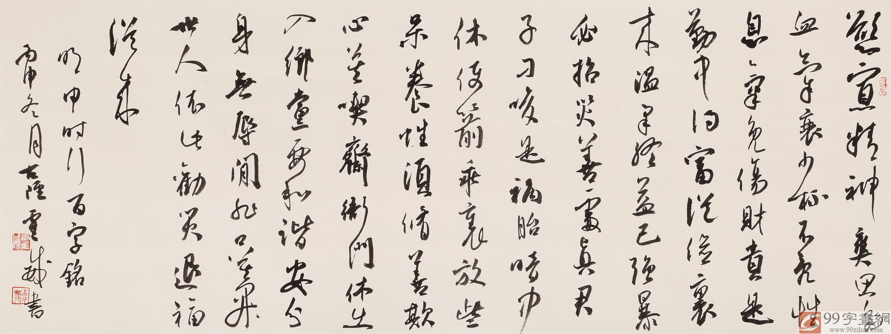本幅书法作品,是书法家霍威录写明代申时行《百字铭》一文,内容为:“欲寡精神爽, 思多血气衰。少饮不乱性, 忍气免伤财。贵自勤中得, 富从俭里来。 温柔终益己, 强暴必招灾。 善处真君子, 刁唆是祸胎。 暗中休使箭, 乖里放些呆。 养性须修善, 欺心莫吃斋。 衙门休出入, 乡党要和谐。 安分身无辱, 闲非口不开。 世人依此语, 灾退福星来。”《百字铭》为修身养性之佳文,书法家笔力劲健、行云流水,挂于室内,赏心悦目,陶冶情操!
