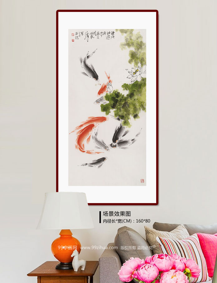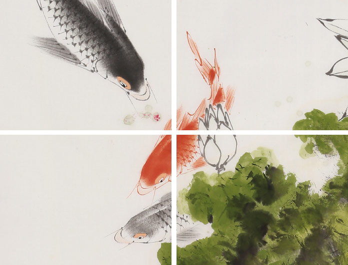 孙海峰的鲤鱼画;以鱼为师,得形入神。他的作品以工笔和写意相间,笔墨劲挺流畅,色彩明洁秀丽。其画的鱼灵动活泼,栩栩如生,神韵充盈,笔墨老到。取材来自于生活却又超越生活。大胆概括简化,纯墨色的构图也有着丰富的意境,显示出画家高超的艺术功力。