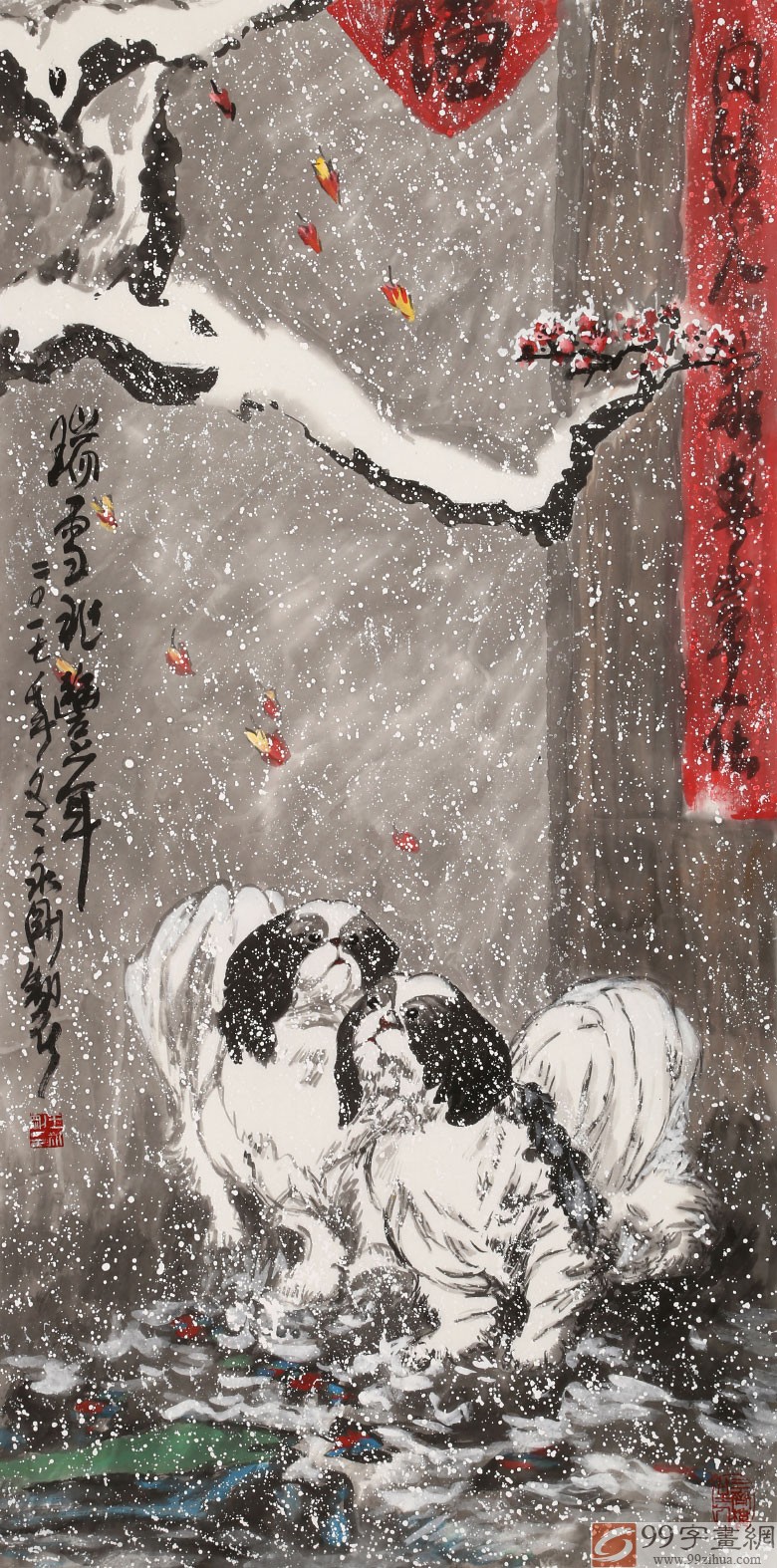 【艺术简评】2018,戌狗祈福。古人认为,狗除了有预兆吉凶灾异的象征作用以外,还有除灾赐福招财的作用。狗一直被视为吉利的动物,狗的叫声也谐音“旺”,其寓意吉祥,被人们视为财富来临的前兆,民间有俗语说,“狗来福,钱入库”。