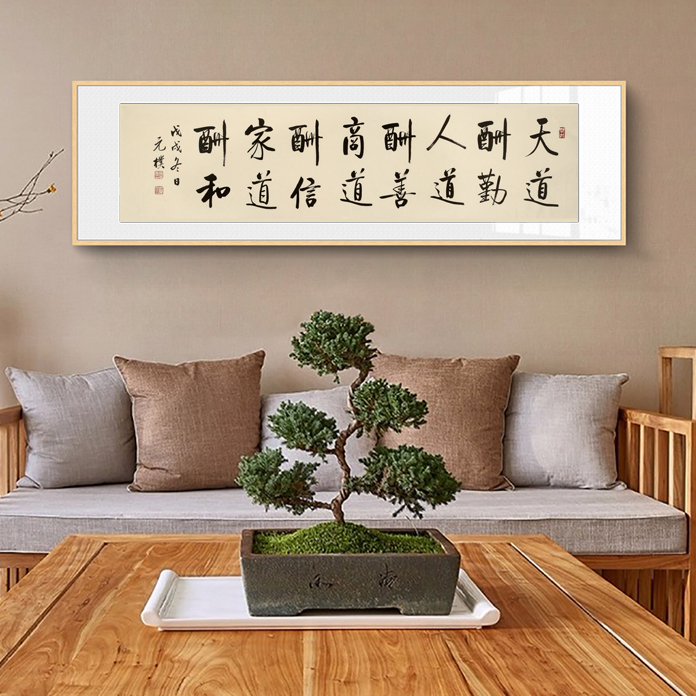 天道酬勤 人道酬善 商道酬信 家道酬和 —— 人生处世哲言。本幅书法适合办公室、经营场所、客厅书房悬挂。