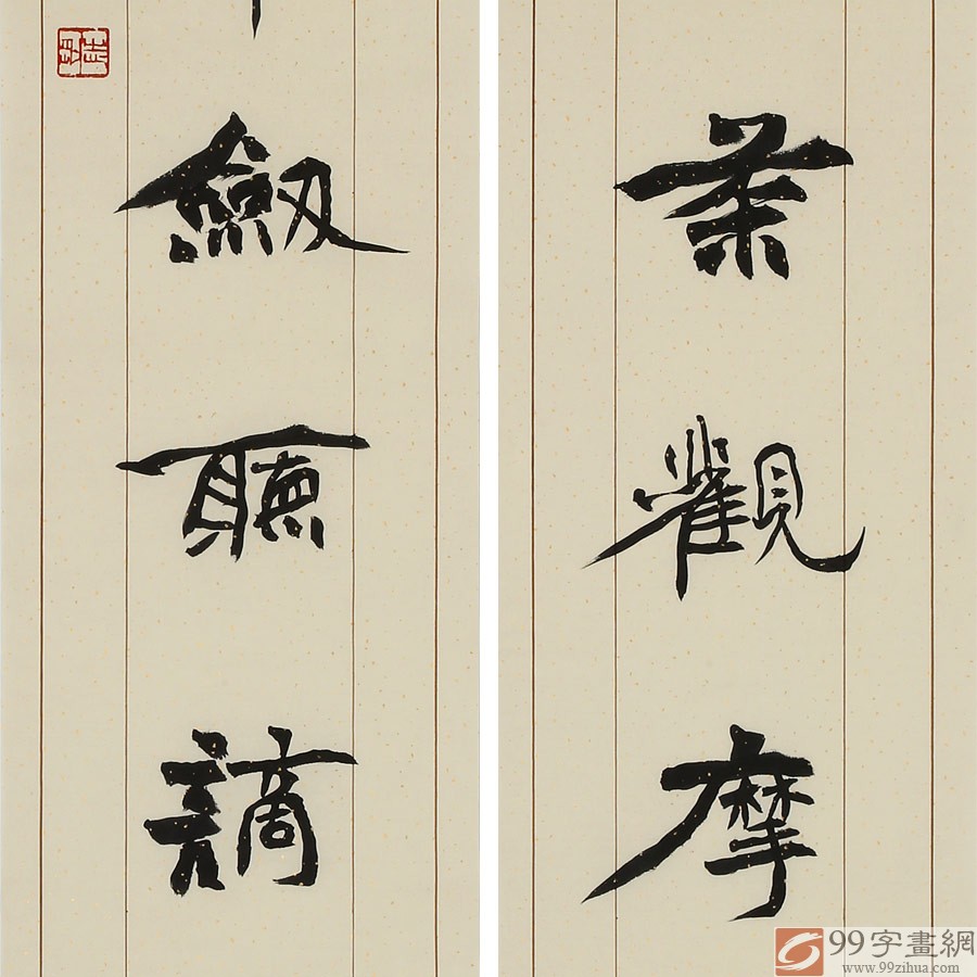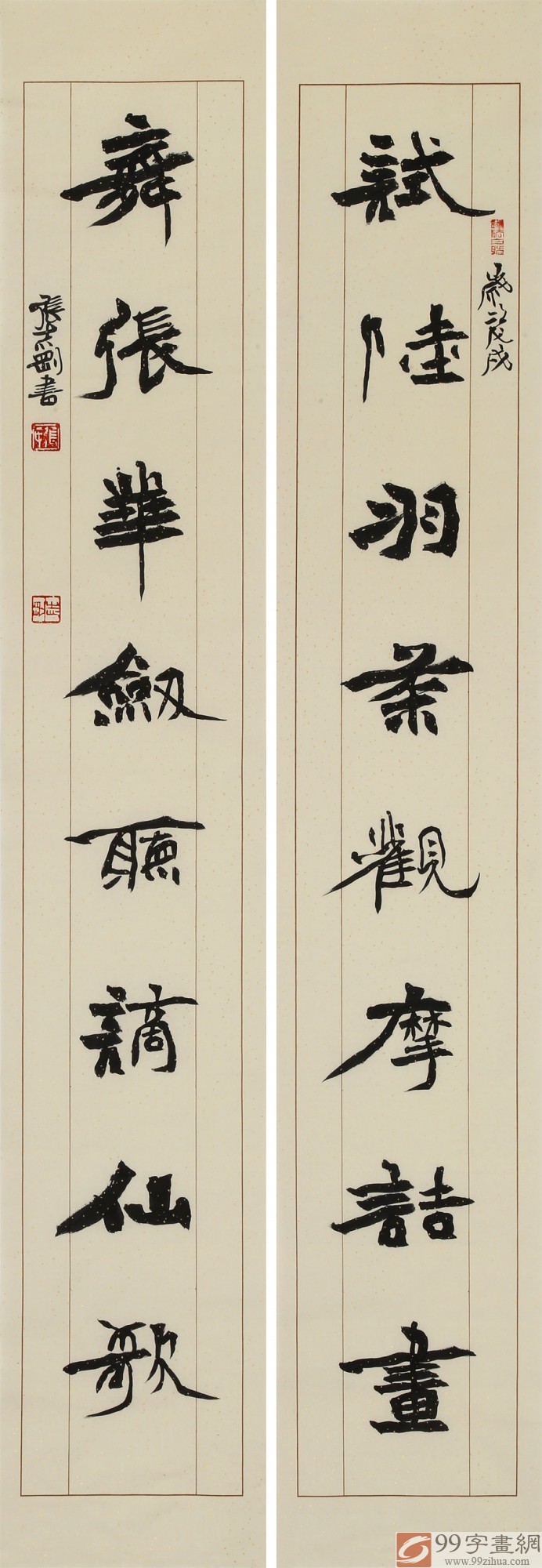 对联内容为:试陆羽茶观摩诘画 舞张华剑听谪仙歌。张志刚,天津著名书法家,师从北碑巨匠孙伯翔先生,书风险峻多姿、劲拔刚健,具有极高的欣赏和收藏价值。