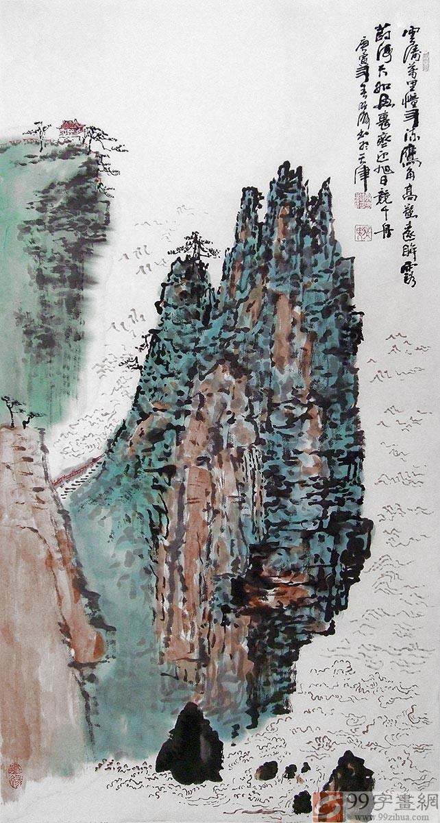 【作品简评】李明成的山水画山势造型奇崛,本副作品水流湍急,涛声如怒,岩石陡峭,而山顶一亭更是画龙点睛之笔,表现了人之伟力。
