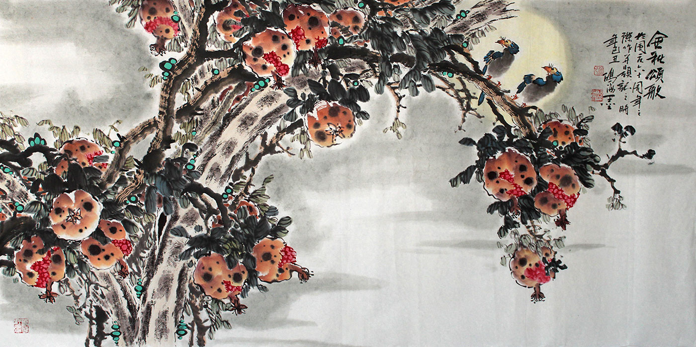中国人视石榴为吉祥物,以为多子多福的象征。古人称石榴“千房同膜,千子如一”。民间婚嫁之时,常于新房案头或他处置放切开果皮、露出浆果的石榴,亦有以 石榴相赠祝吉者。常见的吉利画有《榴开百子》、《三多》、《华封三祝》、《多子多福》等。 石榴既可观赏又可食用。石榴花开于初夏。绿叶荫荫之中,燃起一片火红,灿若烟霞,绚烂之极。赏过了花,再过两三个月,红红的果实又挂满了枝头,恰若“ 果实星悬,光若玻础,如珊珊之映绿水。”正是“丹葩结秀,华(花)实并丽。”现代生长在我国的石榴,是汉代张骞出使西域时带回国的。人们借石榴多籽,来祝愿子孙繁衍,家族兴旺昌盛。石榴是富贵、吉祥、繁荣的象征。《笑迎天下客》是99字画网团队老师作品,寓意美好,具有极佳的装饰与收藏价值。