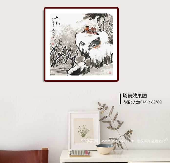 【作品简评】 鸳鸯,千百年来,鸳鸯一直是夫妻和睦相处、相亲相爱的美好象征,也是中国文艺作品中坚贞不移的纯洁爱情的化身,备受赞颂。“止则相耦,飞则成双”鸳鸯戏水是民间最熟悉的吉祥图案之一,崔豹的《古今注》中说:“鸳鸯、水鸟、凫类,雌雄未尝相离,人得其一,则一者相思死,故谓之匹鸟。”鸳鸯戏水更是我国民间常见的年画题材常用来形容男女情爱。基于人们对鸳鸯的这种认识,我国历代还流传着不少以它为题材的,歌颂纯真爱情的美丽传说和神话故事。鸳鸯图 《冬韵》可作为家居装饰,更是结婚婚庆字画佳品。
