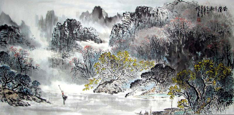 在其中,我们感受到的是画家的智慧与才情。"一手伸向传统,一手伸向生活"的创作理念。从他的画踪里看得出,他倾心与范宽的雄峻,王蒙的茂密,石涛的沧劲,其画格近于宋人的骨气,元人的风韵,层峦叠嶂,骨体坚实且墨法精致,境界十分宽远,格调也十分明朗大气。