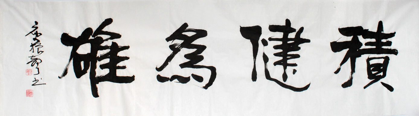 庾振声是位风格型书法家。他的书法作品追求大气,力避局促精小,以显其博大浑穆;追求超迈,力避软弱浮滑,以显其精神气格;追求自然,力避做作牵强,以显其纯 真本色;追求拙朴, 力避俗甜姿媚,以显其深沉典雅;追求气韵内涵,力避巧饰外露,以显其神韵自得。这种个性化与境界化较为默契的融合,促使他的创作展现了一种建立在高境界、 高规格基础上的个性表现。他的作品,用笔遒健,力透纸背,使转果断,变化多端,逆侧之锋皆能得心应手、驾驭自如,且润燥相间,浓淡适宜,境界当在老辣纷披 与含蓄蕴藉之间。加上隶书、章草、金文笔意的穿插运用和交替出现,使用笔达到了一种较为熟练且丰富多彩的境界。