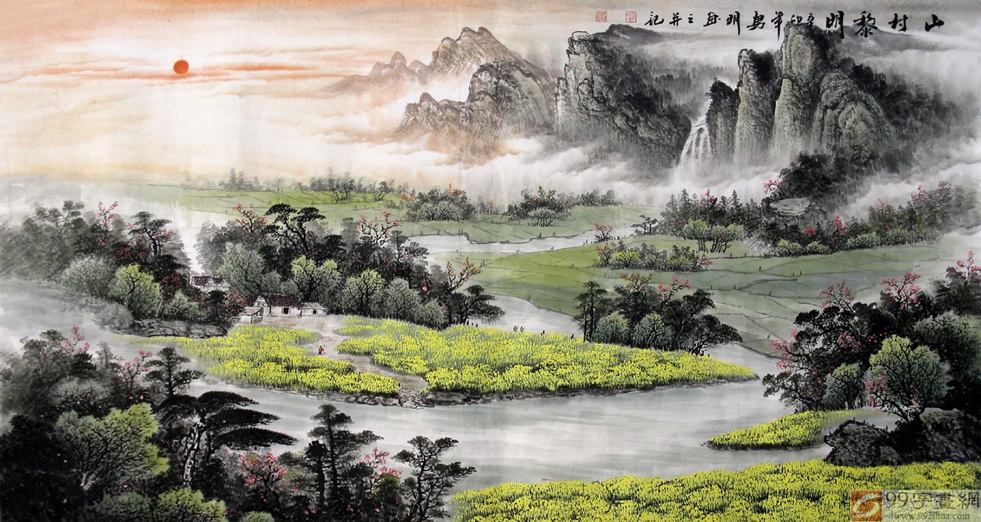 整副作品富含风水意蕴:前有财路(金色油菜花,寓意黄金满地),后有靠山(龙脉连绵不绝);左有招财树,右有挡灾树;一轮红日挂天边,鸿运当头照,溪水庭前过,细水长流。本副作品适合悬挂在家中客厅。