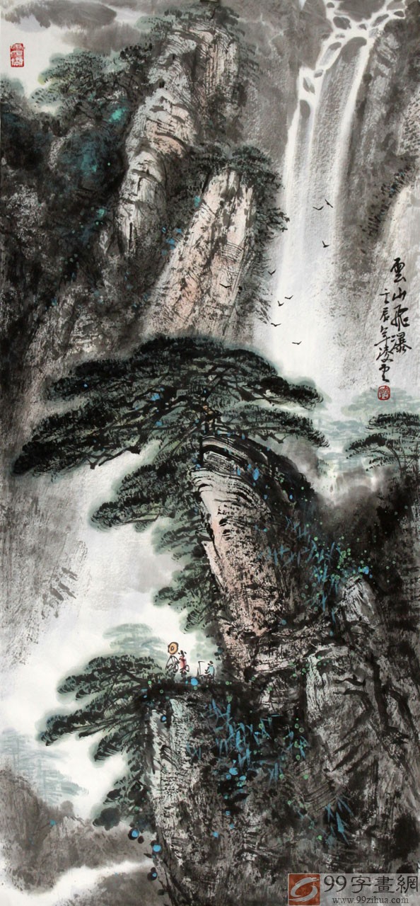 观王凌云作品,画中崇山峻岭,巍峨挺拔,山石高耸,植物丰密。山脚下古松参天,枝叶繁茂,树下有屋舍几间,临溪而建,远望,一派春光淡怡之景。其用笔章法缜密,山石披麻、兼以破笔。树干用笔古拙而灵活,颇为雅致。凌云自幼酷爱书画,崇尚艺术,醉心于笔墨丹青,尤对山水情有独钟。曾研习历代名家山水画作,并遍访名山大川,师法自然,领悟山水神韵。 作品力求气势磅礴,既有大山大水的雄伟壮观,又有山寒溪流的田园小景,即清新隽永且耐人寻味。——摘自【中国艺术报】王凌云:山水有道