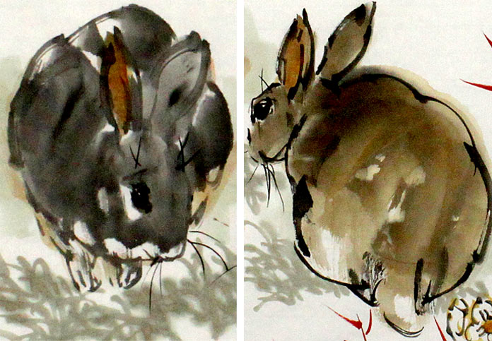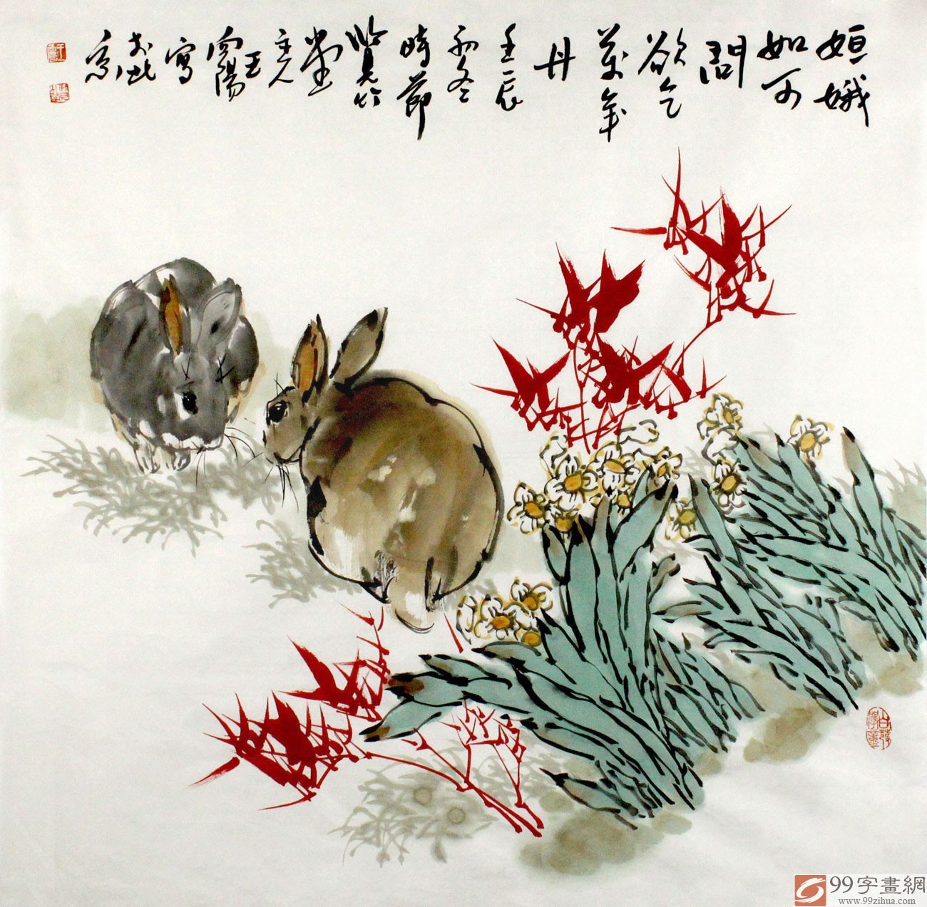 【作品简评】(99字画网艺术评论员玉洁)“兔”同“途、图”指大展宏图、发奋图强、前途似锦、前途无量等;“百合花”花色洁白,状如喇叭,在中国百合具有百年好合、夫妻和美、家庭和睦等;“红竹”纤细柔美, 长红不败,喻青春永驻,有励志的说法,是喜庆、吉祥的象征!此幅图是著名画家王向阳精心刻画之作,绘双兔、红竹、百合,将兔子的神态动作刻画的形象逼真、神态把握极其到位,墨味十足、笔法酣畅淋漓,这些均显出画家极高的艺术水准。王向阳先生的作品先后被【艺术界】,【中国收藏】,【中国美术报】,【中国艺术】,【中国书画】等报刊发表,部分作品被日本,韩国, 法国友人收藏。