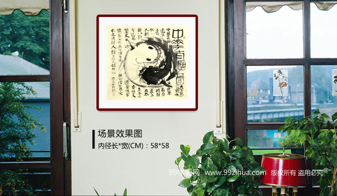 【作品简评】太极阴阳鱼图是阴阳螺旋力场的直观显现,人早晨醒来时,身体由阴而阳,承接天地之阳,而精力勃发,投入一天的工作;午时,天地之阳盛极而阴,于午时小睡一会儿,促使阴阳交变,又转入午后工作之中。这幅《中华太极图》绘两条阴阳鱼双双交合而成,以漩涡状盘绕在一起,一白一黑,二者此消彼长,相互媾和,两两交叉,阴阳同体,相互怀抱,这是原始社会生殖崇拜的产物。两条怀抱相扣鱼在风水上喻意为“鱼水情深”、“年年有余、岁岁平安、和谐社会、生活美满”等。——周自豪的《年年有余太极图》与中国美术的智慧