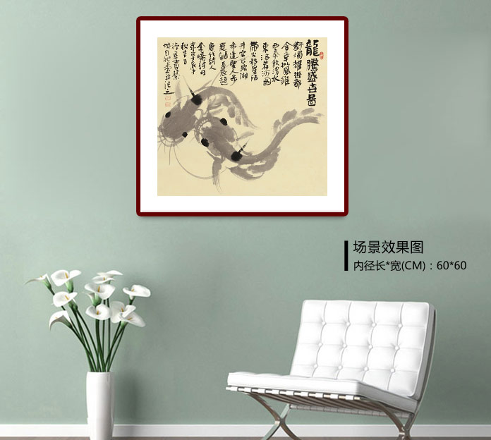【作品简评】禅意画家周自豪以写意的手法,描绘了其乐融融的太极鲶鱼图,笔墨雄浑,挥洒自如,构思精巧,以高纯度的黑色画鱼眼与鱼背,以淡墨色绘于鱼的其他部分;两条鱼绘于画中使主题更为明确,和谐温馨,使画面充满情趣,充满笔墨韵味。“鲶鱼”顾名思义就是“年年有余”,鱼生于水中,游于水中,有水则有财,故有年年有余,财源滚滚等寓意。——周自豪的《年年有余太极图》与中国美术的智慧