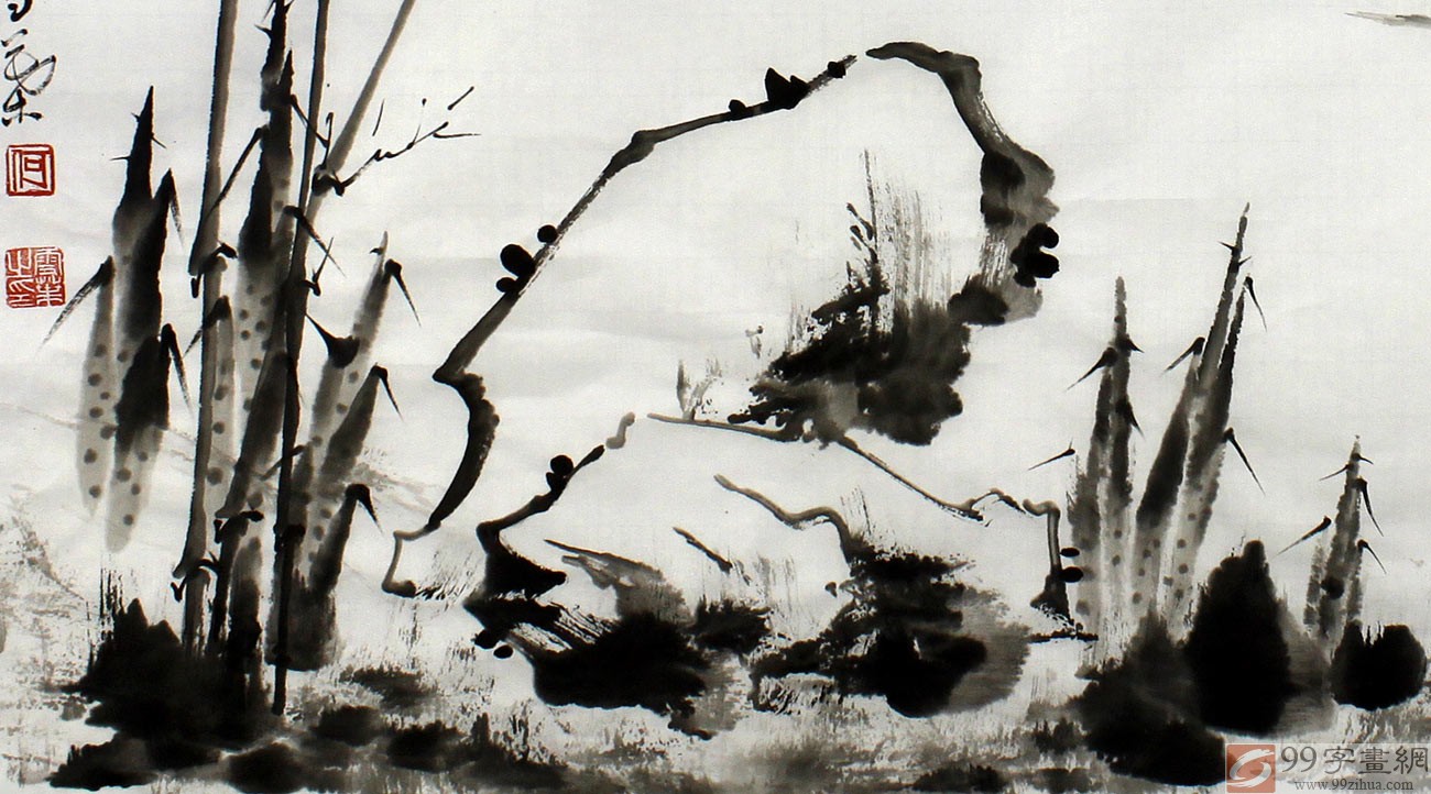 【作品简评】(99字画网艺术评论员路丰)何华贤的这幅《风雨长吟》竹竿挺拔有力、直穿云天,竹叶墨色浓淡相宜,笔笔力透纸背,宛若投匕,竹叶虽不浓密却自有一股清健之气。两只雀鸟飞来,在墨竹间嬉戏玩耍,使画面充满情趣,初笋在春雨的洗礼下茁壮成长,参差错落,摇曳多姿,竹叶流畅,撇点长捺,潇洒自然,寥寥数笔,神韵飞扬。竹雀相映,清幽之气尽洒纸面之上。右方耸立数重陡坡,平淡悠远,意境绵长。整幅作品用笔洒脱、大气、色泽光鲜神情生动,雀鸟娇美可爱,栩栩如生中透露出诗意的情怀,墨竹那呼之欲出的姿态与美丽的春天盎然相趣,表达了作者抒发自然与万物生命和谐坚美的主题。