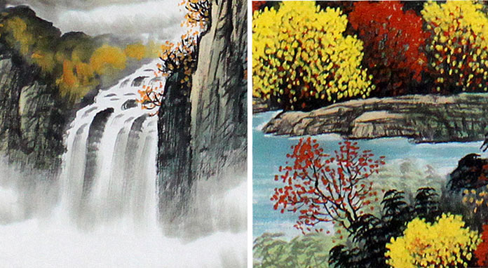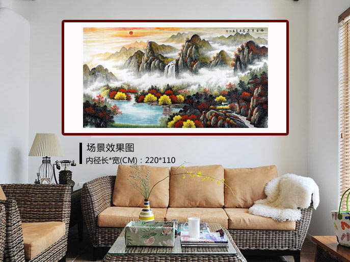 【作品简评】此幅作品大气磅礴中蕴含风水,瀑布长流汇集一起流入宝潭,有聚财之意。烟云在叠叠山峰中穿梭覆盖半山,若隐若现。整幅作品寓意:红日寓意:“鸿运当头”;瀑布寓意:财源滚滚;水潭寓意:“聚宝盆”;整幅作品满含鸿运当头,财运如浩浩瀑水,生生不息之意。作品中远山层峦叠峰,更表达了泉源广长、宝潭聚财的意境。风水上说:“山管人丁,水管财”。因此不管是客厅、办公室、经商场所挂这幅山水画都是非常吉利的 !