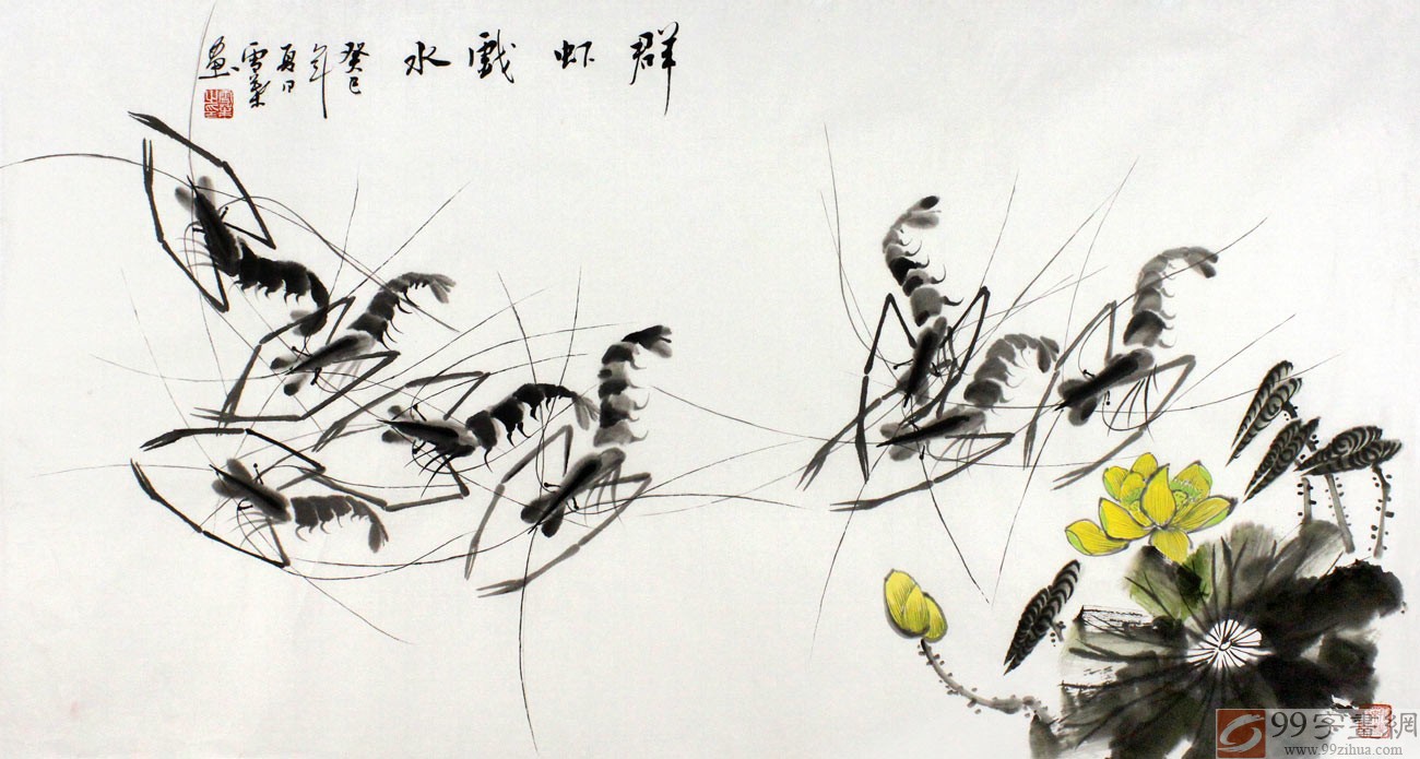 【作品简评】(99字画网艺术评论员路丰)大部分人可能会更多地选择富贵吉祥的牡丹画、有风水含义的山水画、九鱼荷花图、书法等书画作品,可能选择虾趣图的会比较少,主要是人们不懂得虾在现实中的寓意是什么。虾的寓意深刻,北方喻其为“龙”,有镇宅吉祥之意,南方喻其为“银子”,取长久富贵之意。虾对同族之物从不侵袭与伤害,和谐相处,身躯虽小,玉洁透明,淡泊名利,有高尚的品格和纯洁坦诚的胸怀,表明了洁身自好的人生寄托。