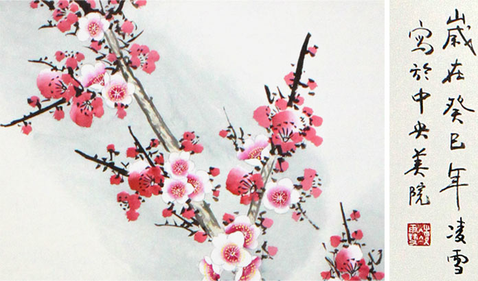 【作品简评】(99字画网艺术评论员晓曼)牡丹以其色、香、姿、韵之美,被人们寓为美满幸福、吉祥如意、富贵繁荣、和平昌盛的象征,奉为“国花”;梅花经霜傲雪、不惧严寒、超凡脱俗,自古以来就是文人墨客笔下的常客,梅花常被民间作为传春报喜、长寿的的吉祥象征。图中这幅《花开富贵》所绘牡丹有苍劲厚重,飘逸幽静,梅花姿态尽显,花色艳丽,数朵梅花如星星眨眼,明晶晶、亮闪闪,疏密流畅,以独有的意境美诠释着传统艺术的精髓,在画家们的演绎之下,可谓是花姿百态。