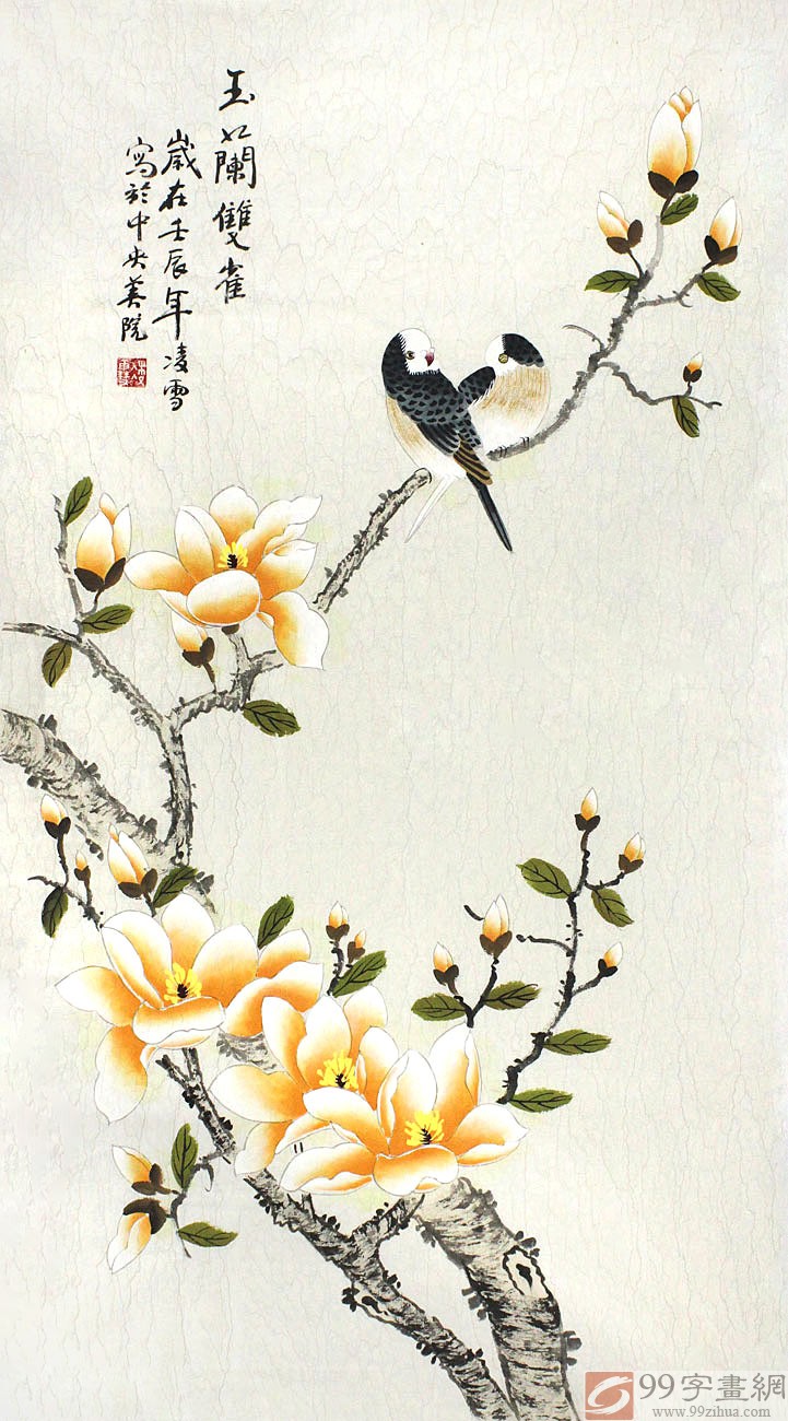 【作品简评】(99字画网艺术评论员晓曼)凌雪老师的《玉蘭双雀》图,绘画风格细腻、艳丽、富有神韵,画风清新绚丽,笔墨和谐,富有新意。画面玉兰造型写实、严谨,构图疏密有致,线条精细,笔力遒劲,色调温润且俯仰正侧的玉兰花皆有法度,无不精道,给人富贵文雅,安逸的美感。图中灵动乖巧的双雀更是使画面充满了生机。玉兰花历来被人们视为吉祥之物,而本图花开繁茂,枝叶舒展,设色隐秀大方更给人带来了美的视觉和吉祥的预兆。
