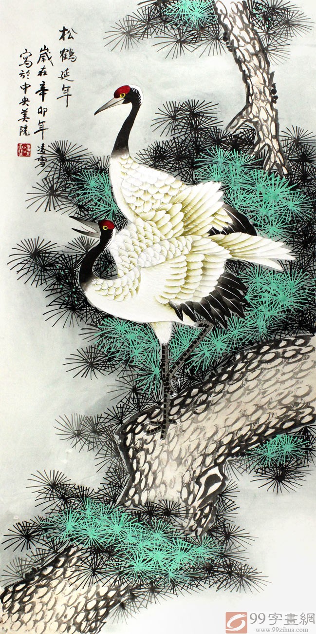 【作品简评】(99字画网艺术评论员晓曼)松树高大挺拔,气宇轩昂,不仅观赏价值有目共睹。在中国松与竹、梅一起,素有“岁寒三友”之称,松柏象征坚贞,松枝傲骨峥嵘,松树且四季长青,历严冬而不衰。北京美协凌雪老师笔下的松树亦是不卑不亢,不屈不饶,形似神似,表现了朝鲜人民的一种高尚的精神情操和人格追求。鹤被道家看成神鸟,在鹤前加仙,又称仙鹤,是长寿的代表。松鹤,象征幸福、长寿、延年益寿等,又合中国的阴阳“五行”金木水火土。寓意祝寿之含义。此幅《松鹤延年》寓意健康长寿;也有志节高尚之意。常用来送给老人,送给父母,祝福长寿。