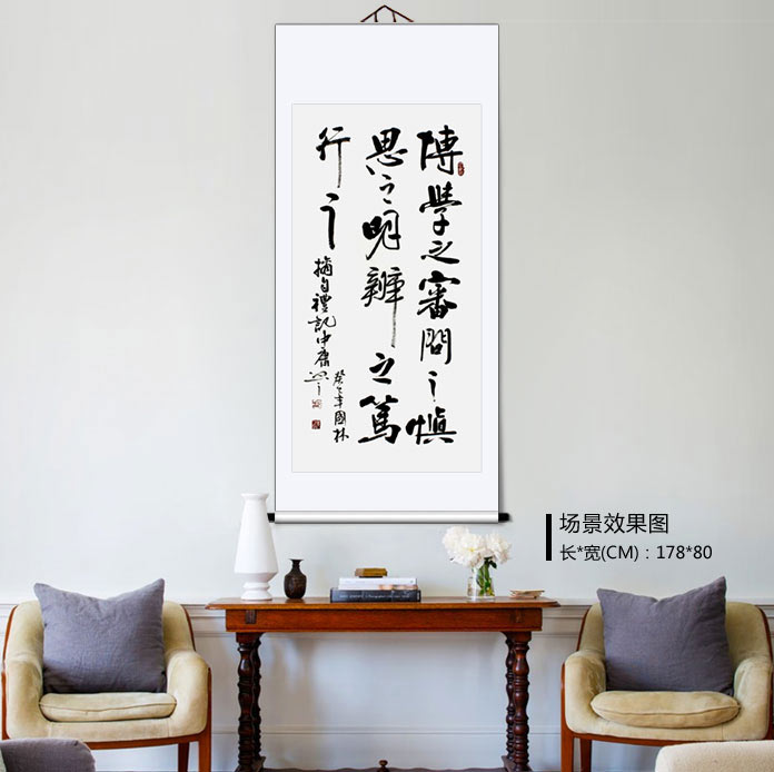 【作品简评】(99字画网艺术评论员路丰)本幅书法作品出自《礼记·中庸》十九章,将学习分为五个阶段。其中“博学之”为学习的第一阶段,意为学习首先要广泛的猎取书籍,培养充沛而旺盛的好奇心;“审问之”为第二阶段,有所不明就要追问到底,要对所学加以怀疑,问过以后还要通过自己的思想活动来仔细考察、分析,否则所学不能为自己所用,是为“慎思之”;“明辩之”为学习的第四阶段,学是越辩越明,不辩,则会鱼龙混杂,真伪难辨,良莠不分;“笃行之”是为学的最后阶段,就是既然学有所得,就要努力践履所学,使所学最终有所落实,做到“知行合一”。如今,以“博学笃行”为做学问之道,方能学有所依、学有所成、学有所用,现在也用来激励子女好好学习,教育后人奋发向上,是家居书房、客厅、办公室的必备之选!