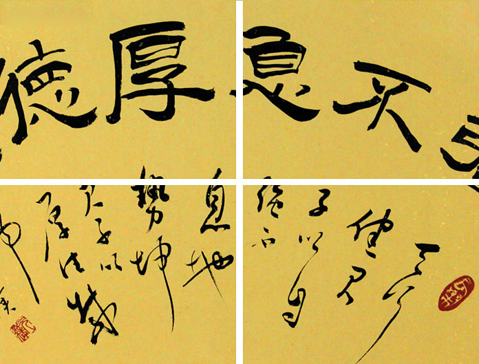 【作品简评】(99字画网艺术评论员玉洁) 《自强不息厚德载物》出自《周易》卦辞中。天(即自然)的运动刚强劲健,相应于此,君子应刚毅坚卓,奋发图强;大地的气势厚实和顺,君子应增厚美德,容载万物。 古代中国人认为天地最大,它包容万物。对天地的理解是天在上,地在下;天为阳,地为阴;天为金,地为土;天性刚,地性柔。认为天地合而万物生焉,四时行焉。没有天地便没有一切。天地就是宇宙,宇宙就是天地。夏广田先生的书法作品,不光受到了书法界的赞许,更受到了普通百姓的喜爱。 欣赏夏广田老师的作品,不仅从中领略神彩韵致,更体现其文化素养和气质品质。