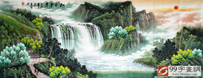 画面寓意深刻:前有财路,后有靠山;左有招财树,右有挡灾树;财源滚滚;红日当头,象征鸿运当头;旭日东升,壮丽壮观,权威旺盛,功名荣达适合客厅,经商场所。为您带来滚滚财源!;整幅作品山形构图极其独具匠心,瀑布寓意:财源滚滚;水潭寓意:“聚宝盆”。