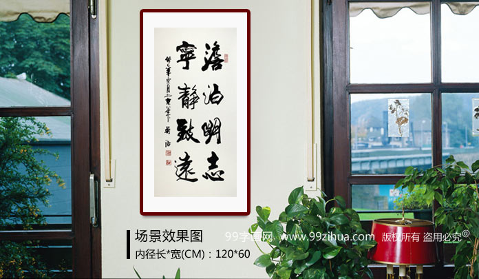 【作品简评】(99字画网艺术评论员玉洁)《淡泊明志 宁静致远》,最早出自西汉初年刘安的《淮南子:主术训》,诸葛亮的《诫子书》也有引用。意为如果没有坚定不移的意志就不能使学业、事业成功,只有具有平稳静谧的心态,才能实现更远的目标。学习必须专心致志,要想增长才干必须刻苦学习。 吴浩先生的书法作品笔力遒劲、气韵畅达、意趣横生,笔墨之间运用地恰到好处,此书法作品适合悬挂在公司办公室、客厅和书房中。