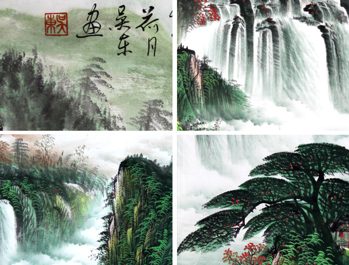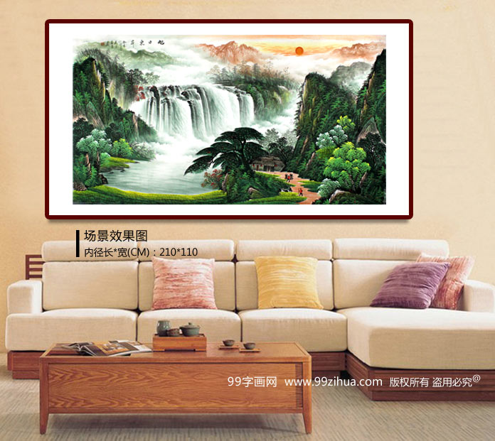 【作品简评】(99字画网艺术评论员玉洁)吴东先生的此幅聚宝盆山水《旭日东升》以“青绿山水”为题材,在掩映错落的空间营造上煞费苦心,他笔端下的丘壑、古松、河流、云霞、瀑水、烟雾、红日、房舍......山峰重重叠叠,水流舒缓长流,瀑水一泻千里飞奔而下,营造一种朴茂幽深的境界。艺术家吴东对山石树木的体积形态描写、阴阳向背的写实刻画与表现都经过了艺术的摆布而刻画的淋漓尽致、惟妙惟肖,他将古典山水的意境与现代形式相结合,借真实的山水景物转化为心灵的自由抒发,营造一幅具有诗情画意的风水聚宝盆,挂在家中财源滚滚、聚财纳福,祝幸福、人财两旺;挂在办公室招财又招客,祝生意红红火火、事业蒸蒸日上!