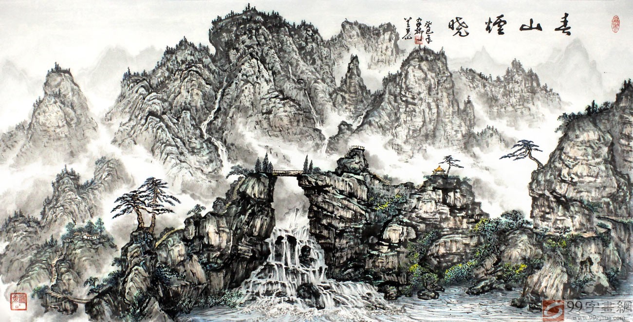 【作品简评】 蒲家瑞笔下的这幅《春山烟晓》,笔墨苍润,画风朴拙,远处山峦连绵不绝,画云中的山,山中的云,高耸入云的山峰伴有漂浮的白云增加了山势的巍峨,表现出氤氲的气氛,两座峭壁之间腾空架起一横桥,桥下瀑布飞奔而下,气势奇险,苍老的古松于山石间伸出。作品笔法凝练遒劲,笔调雄健奔放,在苍老中见清逸。这幅写意山水画是客厅首选,既能为客厅带来一种气势,同时也可提升主人品位。