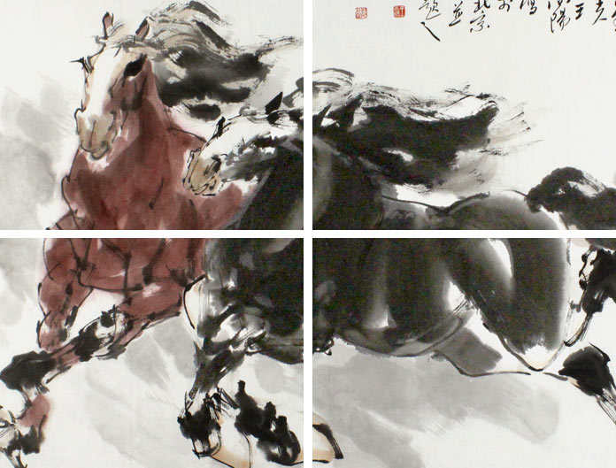 【作品简评】(99字画网艺术评论员玉洁)“比翼齐飞”表面意思是并肩齐进,成双成对,比喻夫妻情投意合,在事业上并肩前进。王向阳先生将此幅《比翼齐飞》双骏图灵动而富有神韵地刻画纸上,两匹一黑一红骏马互倚互靠、并肩齐进,身姿矫健,刚强有力。整幅作品构图讲究,意境深邃,笔墨流畅,红黑马相配寓意和谐幸福、相偎相依,同时,给人以团结和力量的象征,进而鼓舞人们奋发图强,积极向上,是送礼佳品,同时也是夫妻房间最佳字画选择!