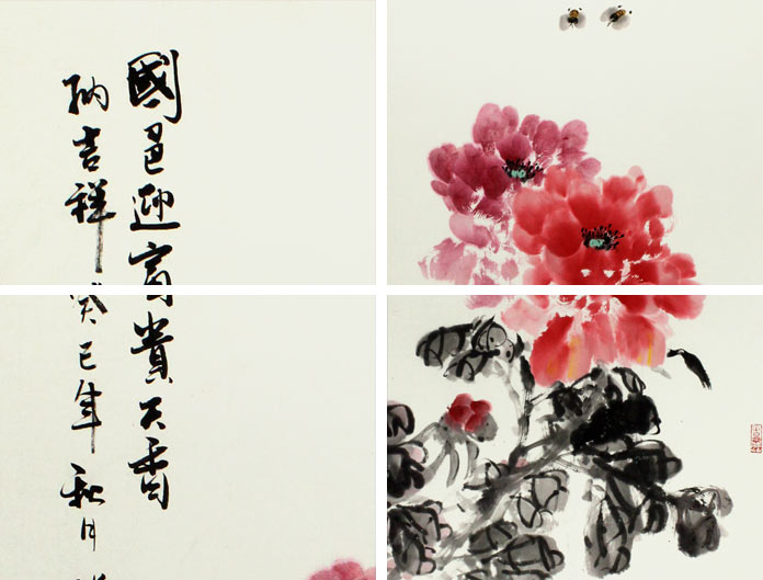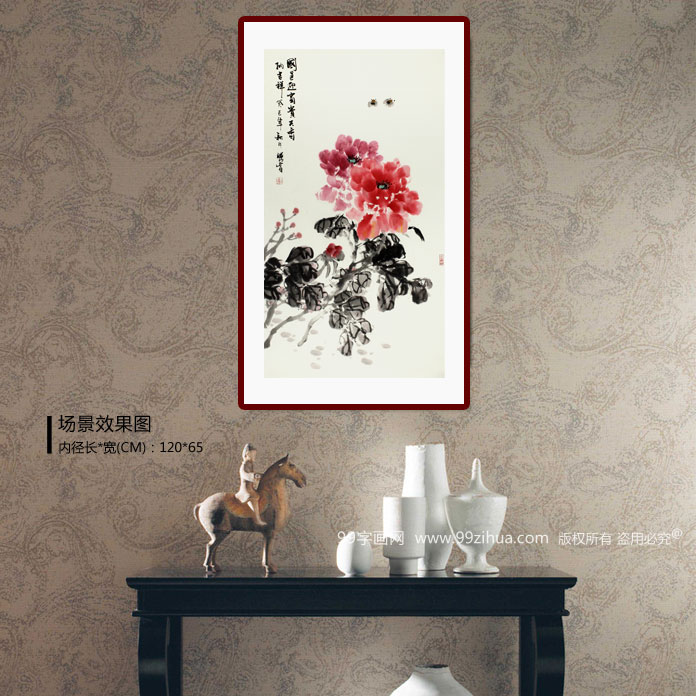 【作品简评】(99字画网艺术评论员灵嫣)李胜春笔下的写意牡丹画绘牡丹富贵妖娆,花大色艳,一深一浅充分展现出牡丹花怒放的激情,把牡丹的雍容华贵展现的淋漓尽致,两只蜜蜂振翅飞舞,为画面增添了不少情趣,同时让牡丹花更富妖娆;枝叶用墨渲染,浓淡相间,墨气淋漓,展现出牡丹的大度之气。自古牡丹就被人们奉为吉祥富贵的象征,这幅牡丹题名为《国色迎富贵 天香纳吉祥》,正是居家挂画的首选,寓意着为家庭带来富贵吉祥,同时又具有较高的观赏价值。