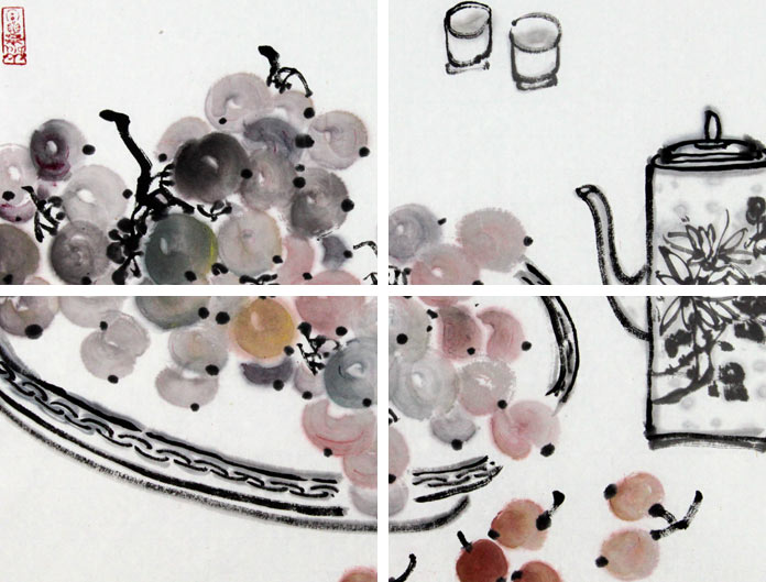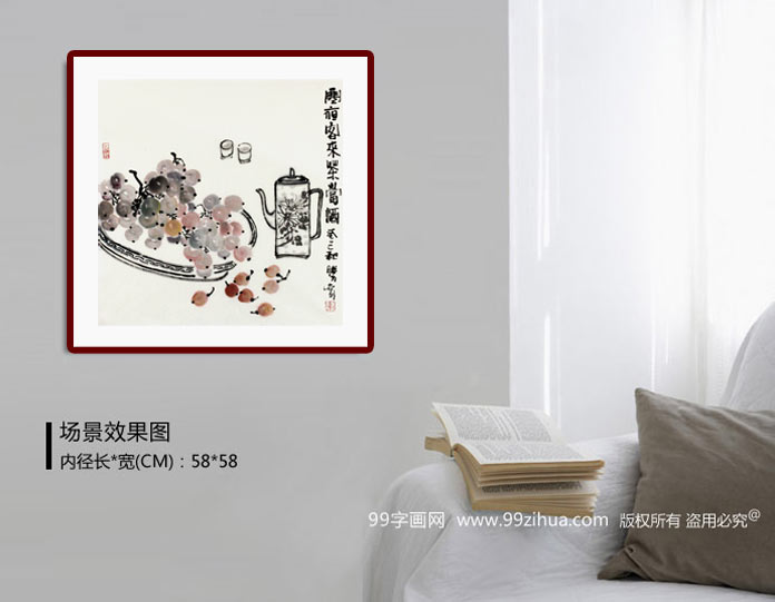 【作品简评】(99字画网艺术评论员晓曼)李胜春先生的这幅国画作品《寒夜客来茶当酒》,绘一个寒冷的冬天,主之客来,家中已没有酒,只有些许葡萄、枇杷等水果,主人只好以茶代酒来迎接客人,虽是简单些,心却是温暖的——不是丰盛的晚餐才可以成为知己,只要心存致远、胸怀宽阔就是最真切的朋友。李胜春先生借葡萄、果盘、枇杷、茶壶、酒盅等勾勒成画,表现一种休闲、惬意的生活情调,此幅书画作品是友情的象征,适合赠送友人或书房、茶楼等装饰悬挂!
