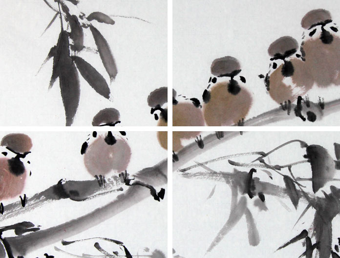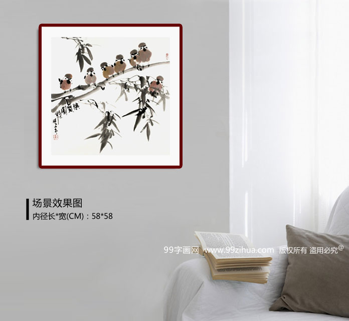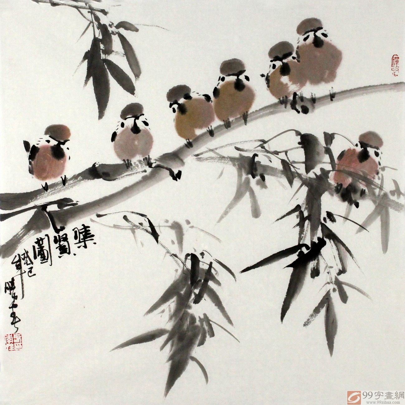 【作品简评】(99字画网艺术评论员晓曼)李胜春先生的这幅竹子群鸟图,绘一横穿揽过的竹竿,竹竿上有并排而立的六只雀鸟,他们或俯仰、或仰头、或侧身、或前往、或振翅、或依靠,其下还有一只活泼可爱的雀鸟紧紧地抓住竹竿,在慢慢吮吸这成长的生命,竹叶疏密得当,墨味十足,在白茫茫的背景衬托下七只雀鸟依旧是那样的活泼和生动,一幅安逸、舒适的画面跃然纸上,是如今卧室、玄关等良好挂画!
