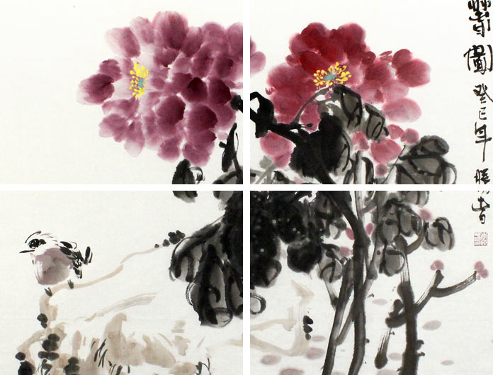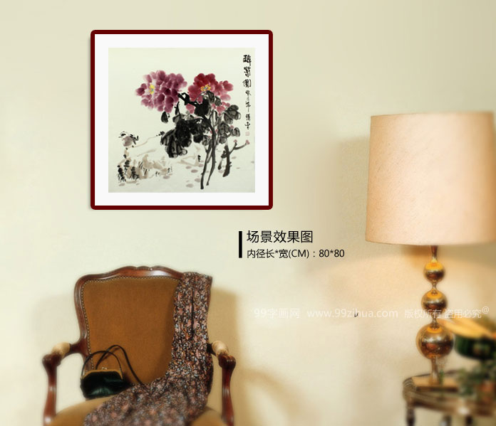 【作品简评】(99字画网艺术评论员灵嫣)李胜春笔下的写意牡丹画《醉紫图》,绘两朵大红大紫的牡丹争奇斗艳,根茎婀娜,枝叶浓郁,花瓣妖娆,从花芯花蕊到萼片无不展现牡丹富贵的气韵,一旁一只雀鸟体态丰盈,俏皮可爱,仿佛陶醉在这牡丹的华贵气氛下洋洋得意,为画面平添几分生动的趣味。作品墨色变化丰富,或浓墨,或焦墨,墨趣横生,牡丹画艳而不俗,形神皆俱,充分展现了作者的用墨水平。牡丹独有的富贵之气是无花能比的,因此,牡丹画常作为居家装饰画,不仅为家庭带来富贵吉祥,同时使家庭气氛因牡丹的华贵而不断得到改善。