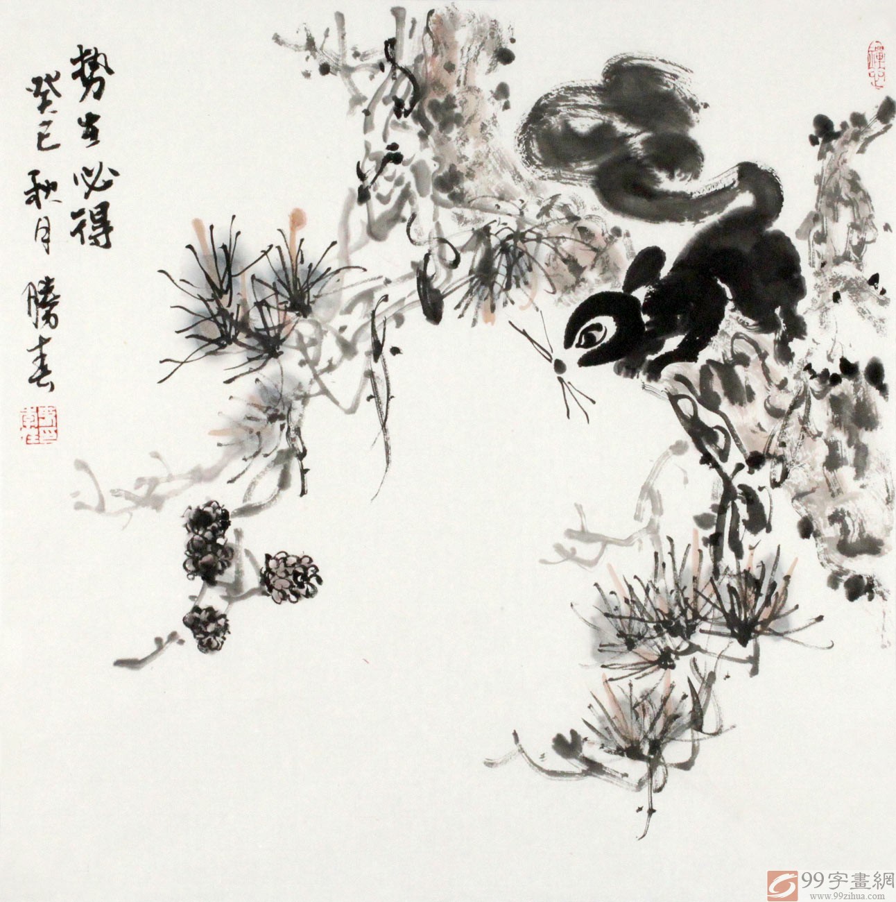 【作品简评】(99字画网艺术评论员晓曼)李胜春先生的此幅动物松鼠图《势当必得》,幅绘一只机巧聪敏、活泼可爱的小巧松鼠攀岩于松树之上,蹉跎的老干松树经历了寒风的摧残,冬雪的磨难,不与繁花争奇斗妍,而是坚强地竖立着、生长着。松鼠有“捷报丰收”的寓意,象征着吉祥喜庆、繁荣昌盛,鼠风流人物还看今朝等。