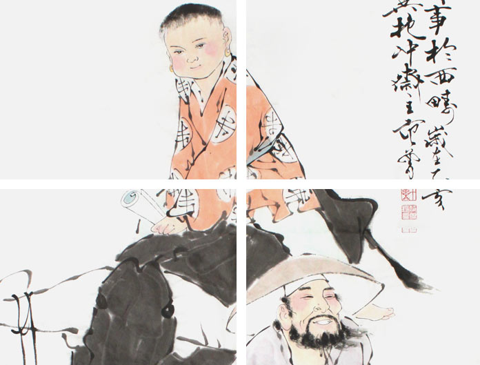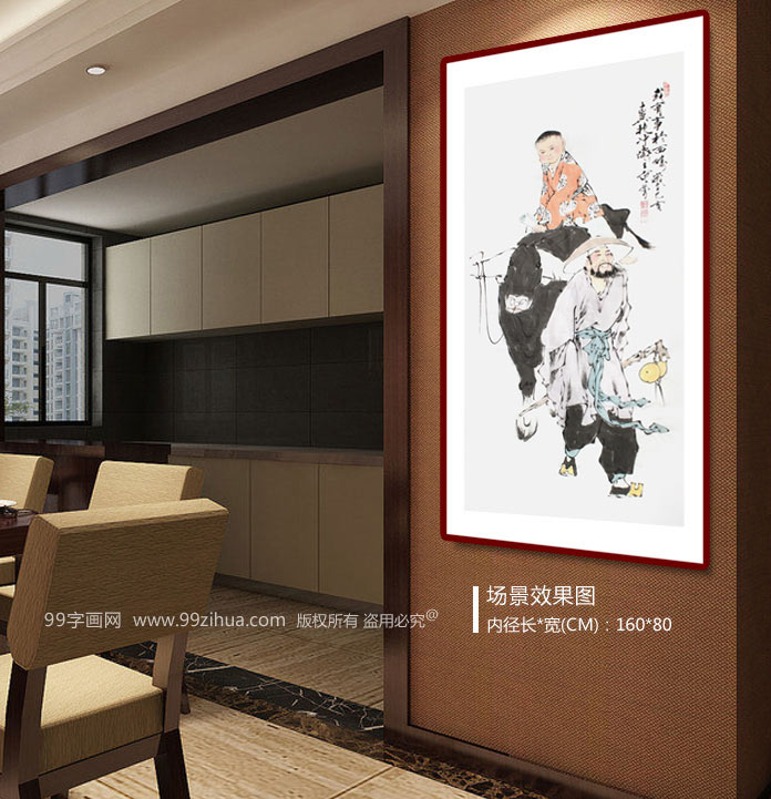 【作品简评】(99字画网艺术评论员路丰)此幅人物画作品,笔墨酣畅,线条流畅,图中以孩童骑于牛背之上,手持书卷,面红润泽,目光朝向前方,一老者在前方带路,面带微笑,双手向后背拢,手持一葫芦拐杖。整幅作品构图巧妙,笔墨层次感强,艺术家以酣畅淋漓的线条将人物的形态逼真地刻画于画,是如今办公室字画之精选!
