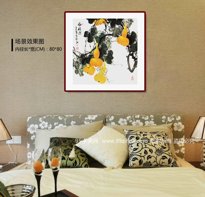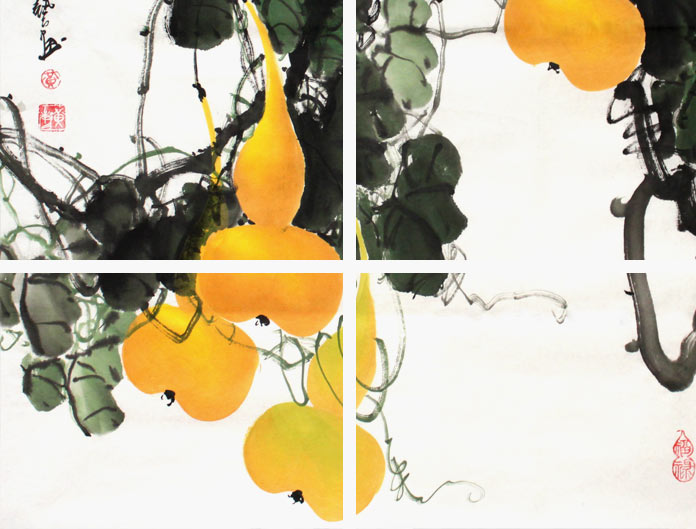 【作品简评】如今,随着生活质量的不断提高,家庭装饰开始注重风水的调节和应用,而国画葫芦被视为辟邪之灵物。在神话传说中,神仙的仙物、法宝,皆为葫芦状,这些足可以显示葫芦的灵气十足。另外,凡是装饰葫芦画,或者是摆放灵宝葫芦器皿的家庭,都能起到有利于家庭的和谐、以及家人的身心健康。