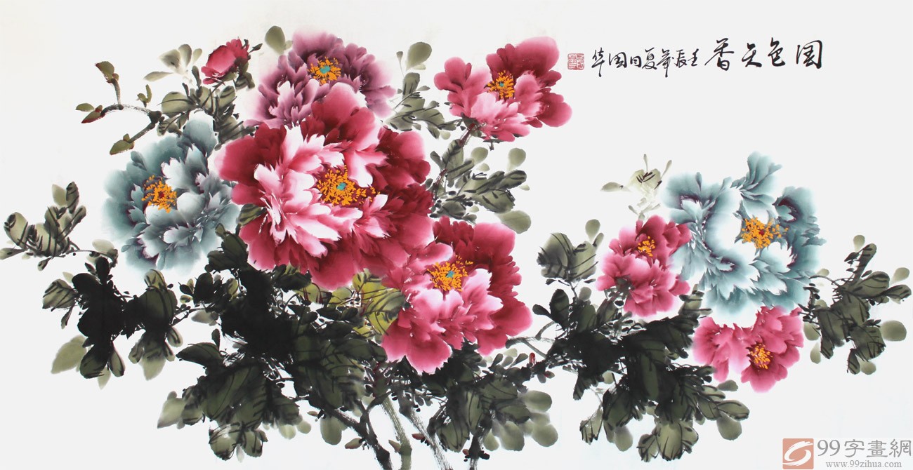 【作品简评】牡丹,有国色天香、花中之王之美誉,千百年来作为富贵的象征,聚财富、纳祥瑞,牡丹或娇艳欲滴,或含羞带露,或飘逸幽静,或含苞待放,或百花怒放等,风格迥异,各有千秋,在99字画网创作团队中,国华先生的牡丹画洒脱、飘逸、富贵、端庄,抒情达意,情寓画中,画显富贵等,是客厅字画、酒店字画之精品之作!