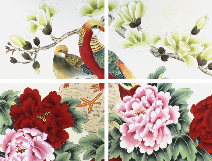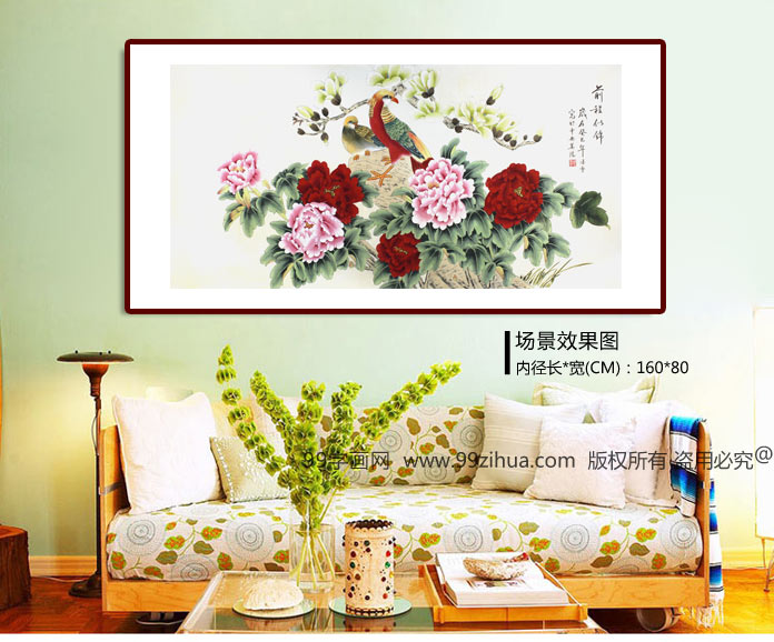 【作品简评】(99字画网艺术评论员玉洁)赏此画作,我们会立刻被画幅的美感所吸引。此幅牡丹画作品《前程似锦》,画作情采斐然,气韵生动,婀娜中颇有秀逸之美,平淡中自由明艳之色,此幅画作,数朵牡丹拥挤怒放,奇石突起,两只锦鸡在奇石上瞩目仰望,或生动,神态逼真,衣装华贵,与牡丹画如此自然地衔接在一起,可谓吉祥、富贵之意,是客厅字画之精选!