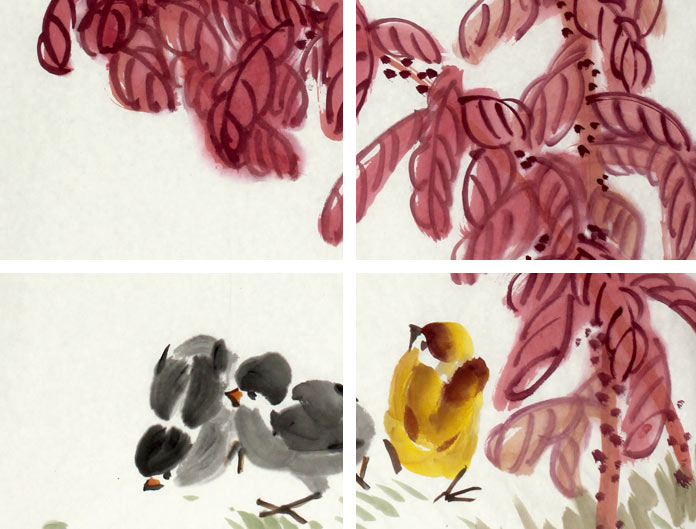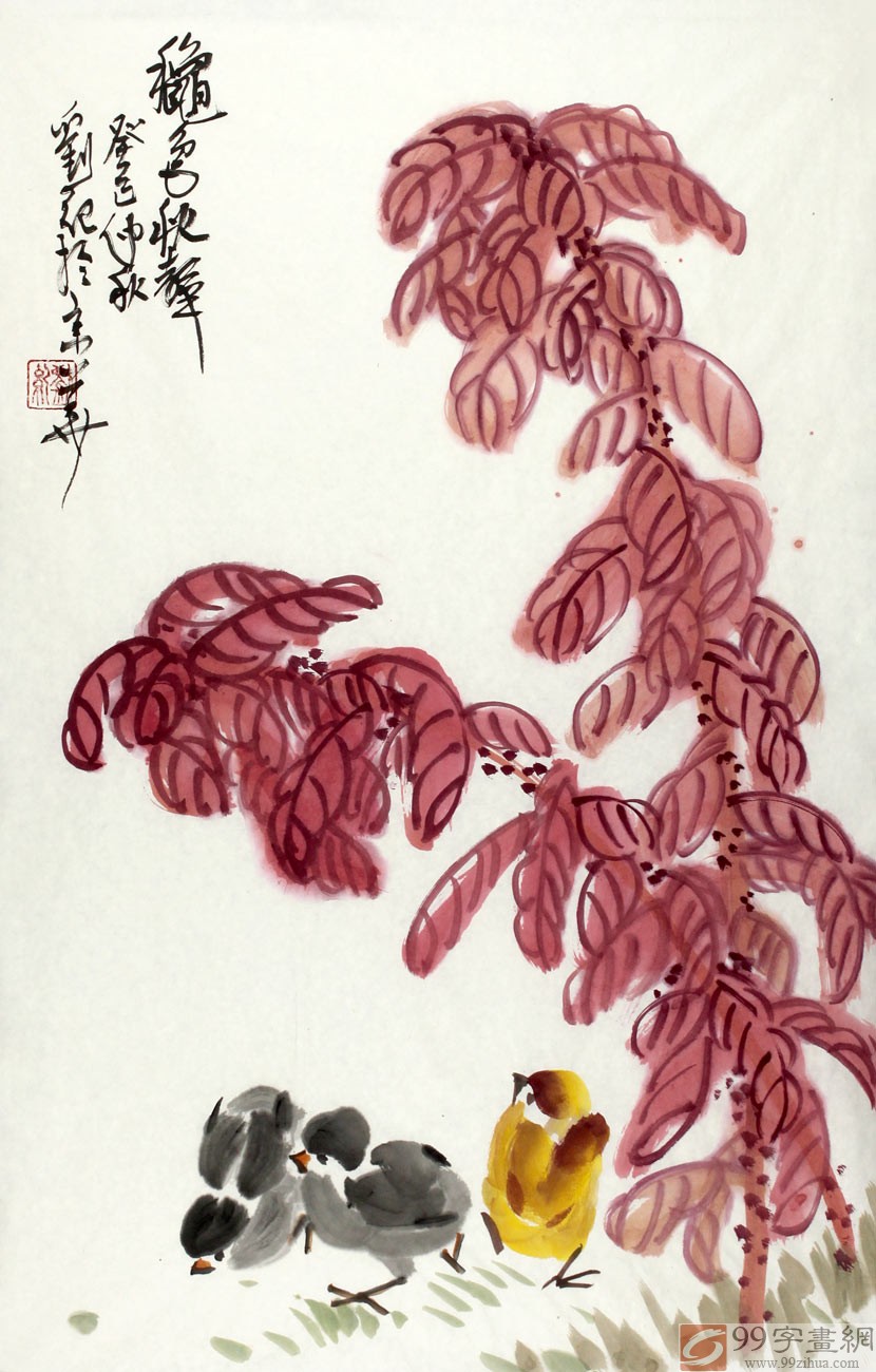 【作品简评】 (99字画网艺术评论员晓曼)刘纪先生的花鸟画作品,古朴率真,线条流畅,设色艳而不俗,画风真实洒脱,是难得的收藏佳作。此幅花鸟画《秋色秋声》绘繁花下三只小鸡在寻觅食物的场景,小鸡动作可爱,形象逼真,设色层次感强,脚下丛草旺盛,呈一派生机勃勃的繁荣景象。整幅画面构图真挚,造型真切逼真,静中有动,动中有静,是难得的收藏佳作!
