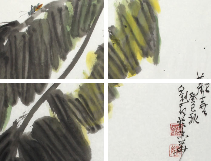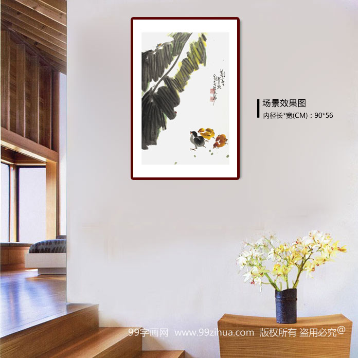 【作品简评】 (99字画网艺术评论员晓曼)刘纪先生的这幅芭蕉群鸡图《欢喜》,一叶芭蕉斜入画面,芭蕉叶大肥厚,墨色酣畅淋漓,叶上一只昆虫攀岩其间,在慢慢品味这成长中的生命,下方一群小鸡飞跑而来,或仰头,或觅食,或前往,姿态各异,造型可爱。整幅国画作品去繁就简,情景交融,是走廊字画、玄关字画的精品之作,郑重推荐选购!