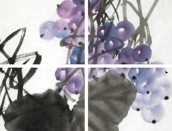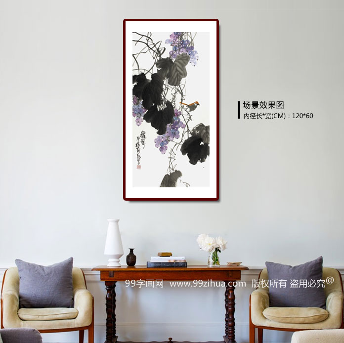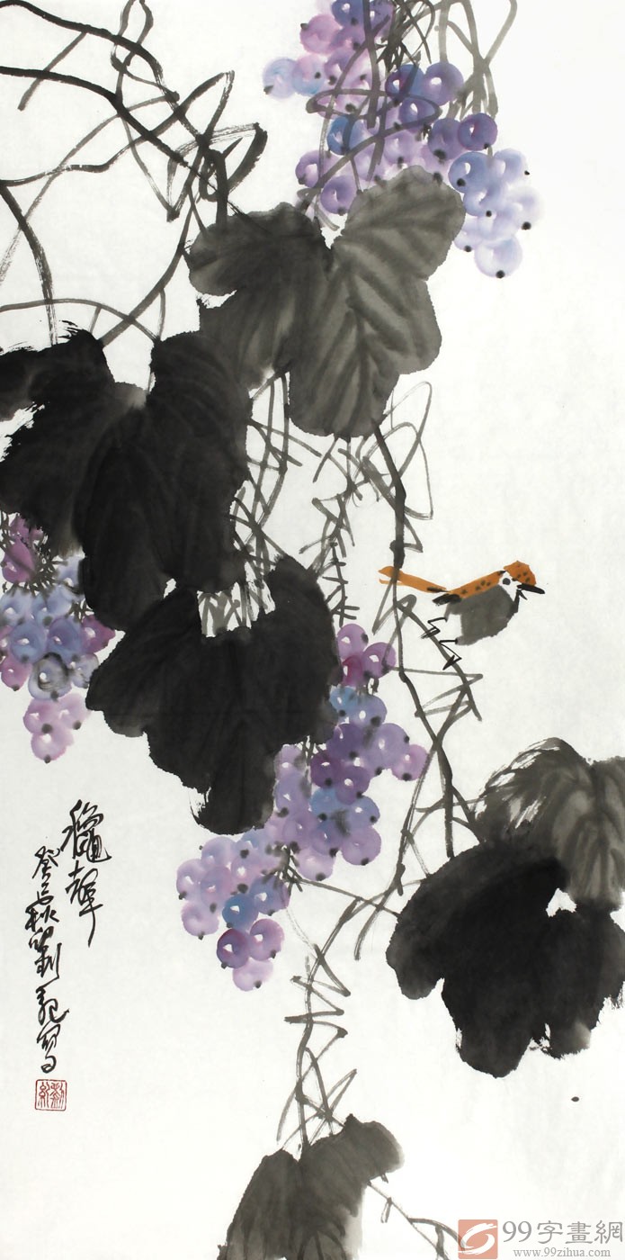 【作品简评】 (99字画网艺术评论员晓曼)刘纪先生的这幅葡萄画作品《秋声》,绘成串的紫色葡萄挂满枝头,葡萄水分多,颗粒满,是民间吉祥图案,又因葡萄有籽,有多子多福、人丁兴旺等含意。此幅国画葡萄,成串的葡萄倒立画面,在缠绕的藤蔓下成长,藤蔓墨色酣畅,叶大肥厚,一只雀鸟远飞而来,停留在藤蔓之上,动作可爱,欲要展翅,是餐厅字画、酒店字画之选,推荐选购装饰!