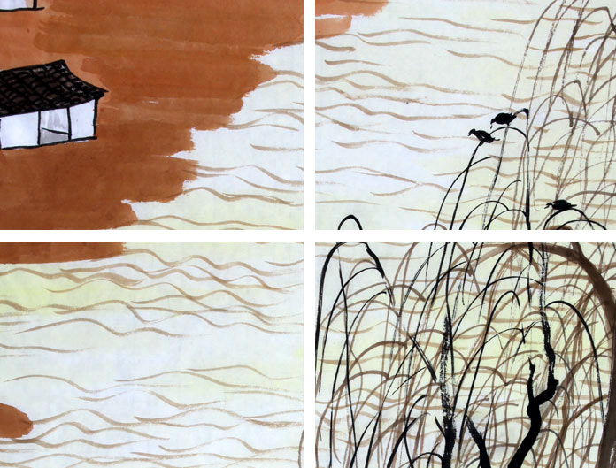 【作品简评】 (99字画网艺术评论员晓曼)《问道柳梢鸟飞还》是刘纪先生拟白石老人的一幅山水画作。画中意境辽阔,月光普照,河中的碧水、池边的房屋、岸上的垂柳、柳下之贤者、柳树上之鸦构成整幅画作的主体,柳条自然下垂,在河流旁轻轻地摇摆着,流水在微风的吹拂下泛着金色的波纹,房屋也被阳光染红了,静谧安详地立于水边,似人间仙境之感,画幅下方一贤者仰头赏景,已是夕阳时分,鸟儿飞回家,朝去晚归,来来回回,正是自然之规律。
