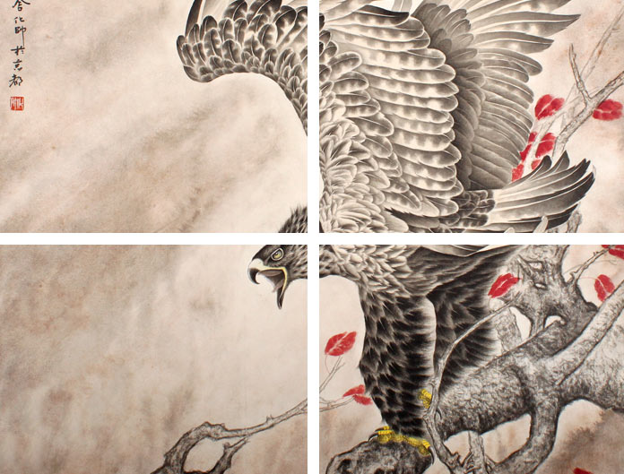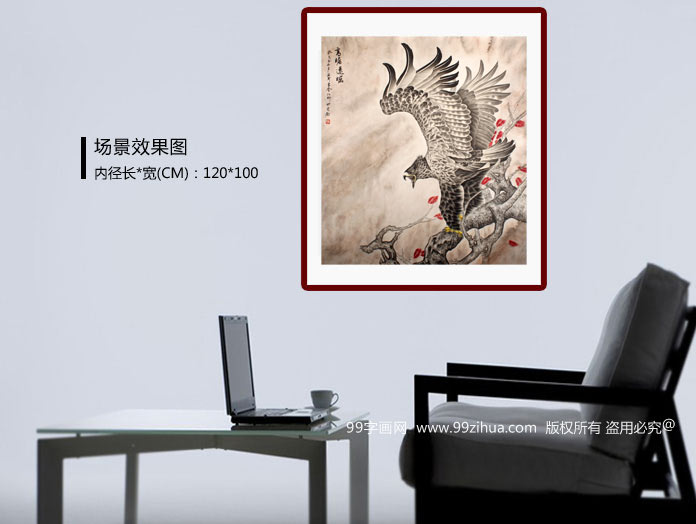 【作品简评】 葛化帅先生的这幅雄鹰展翅图《高瞻远瞩》,一老鹰两爪立于老树之上,居高临下搜寻前行的目标,看上去威风凛凛,鹰爪粗壮有力,眼睛敏锐灵活,振翅欲飞,羽毛层次清晰,浓淡墨用得恰到好处,家中、办公室悬挂它自然平添高雅气氛,同时祝子女学业有成,事业鸿图大展,一路高飞!