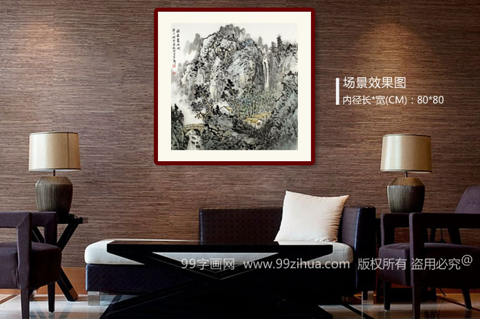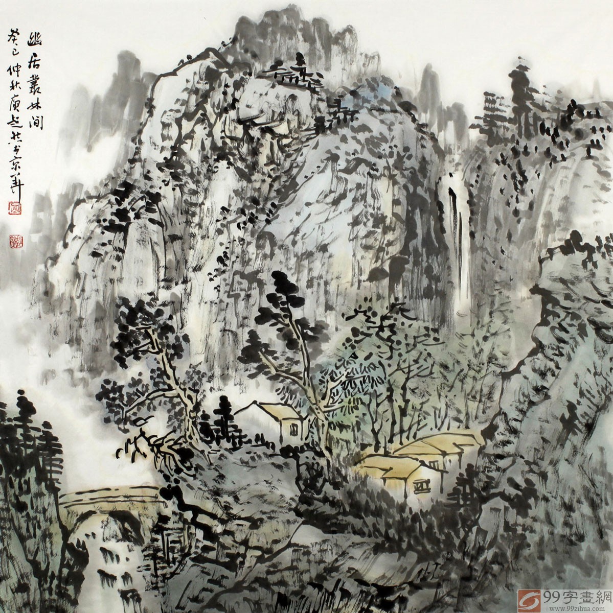 【作品简评】(99字画网艺术评论员玉洁)庾超然先生的这幅水墨山水画《幽居赏林间》,墨色酣畅淋漓,山峰巍峨挺拔,秀润清朗,画家巧妙地运用云气、瀑水、房屋等意象,在恣意泼洒中追求繁而不乱、繁中有奇境之感,给人以新的视觉感受,使画面显出一种舒缓而又大气的精品山水画作,是办公室字画、客厅字画之精品,推荐选购!