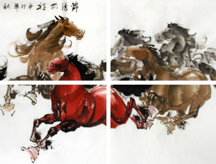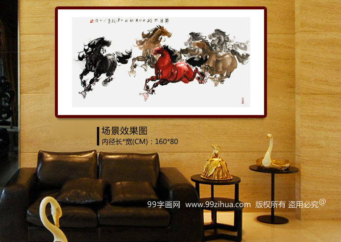 【作品简评】(99字画网艺术评论员路丰)《锦绣前程》为我们展现了一幅气势磅礴、气势恢宏的六骏奔马图,骏马奔腾,脚踏祥云,马鬃扬起,姿态各异,设色明暗有度,层次感强。整幅国画马苍劲有力,笔法流畅自然,欣赏之余,给人一种豪迈之感并隐藏着一股动感,是办公室字画、客厅字画之选,寓飞鸿腾达、马到成功、六六呈祥等,建议选购!