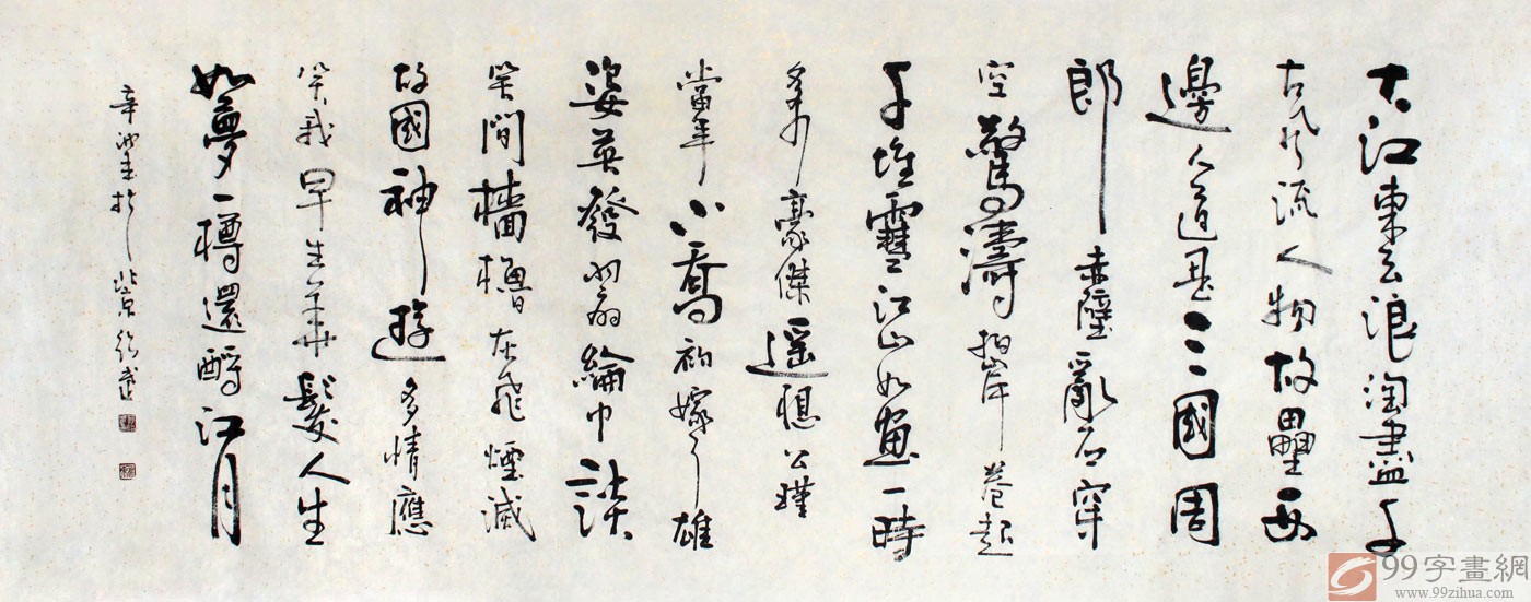 【作品简评】(99字画网艺术评论员路丰) 《念奴娇•赤壁怀古》此词怀古抒情,意境开阔博大,感慨隐约深沉,起笔凌云健举,将浩荡江流与千古人事并收笔下。何绍武先生的书法作品,恢弘大气,纵任奔逸,运笔放纵,行笔快捷,其墨中寓情、笔中有韵,是办公室励志字画、书房字画之选,推荐选购!